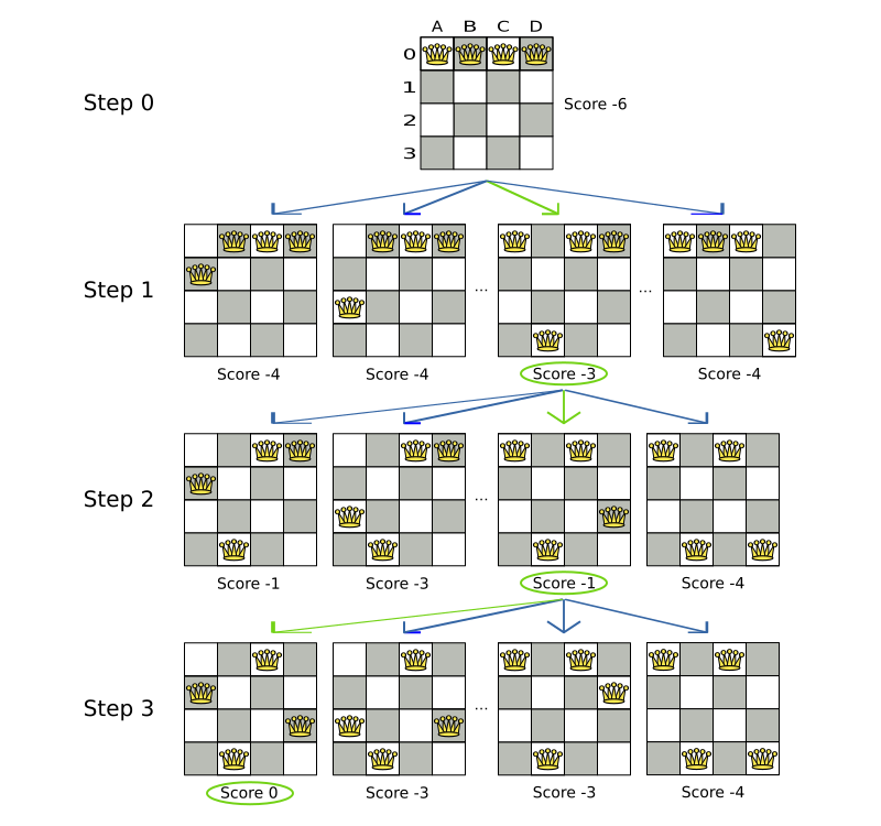Because the move B0 to B3 has the highest score (-3), it is picked as the next step. If multiple moves have the same highest score, one is picked randomly, in this case B0 to B3. Note that C0 to C3 (not shown) could also have been picked because it also has the score -3.